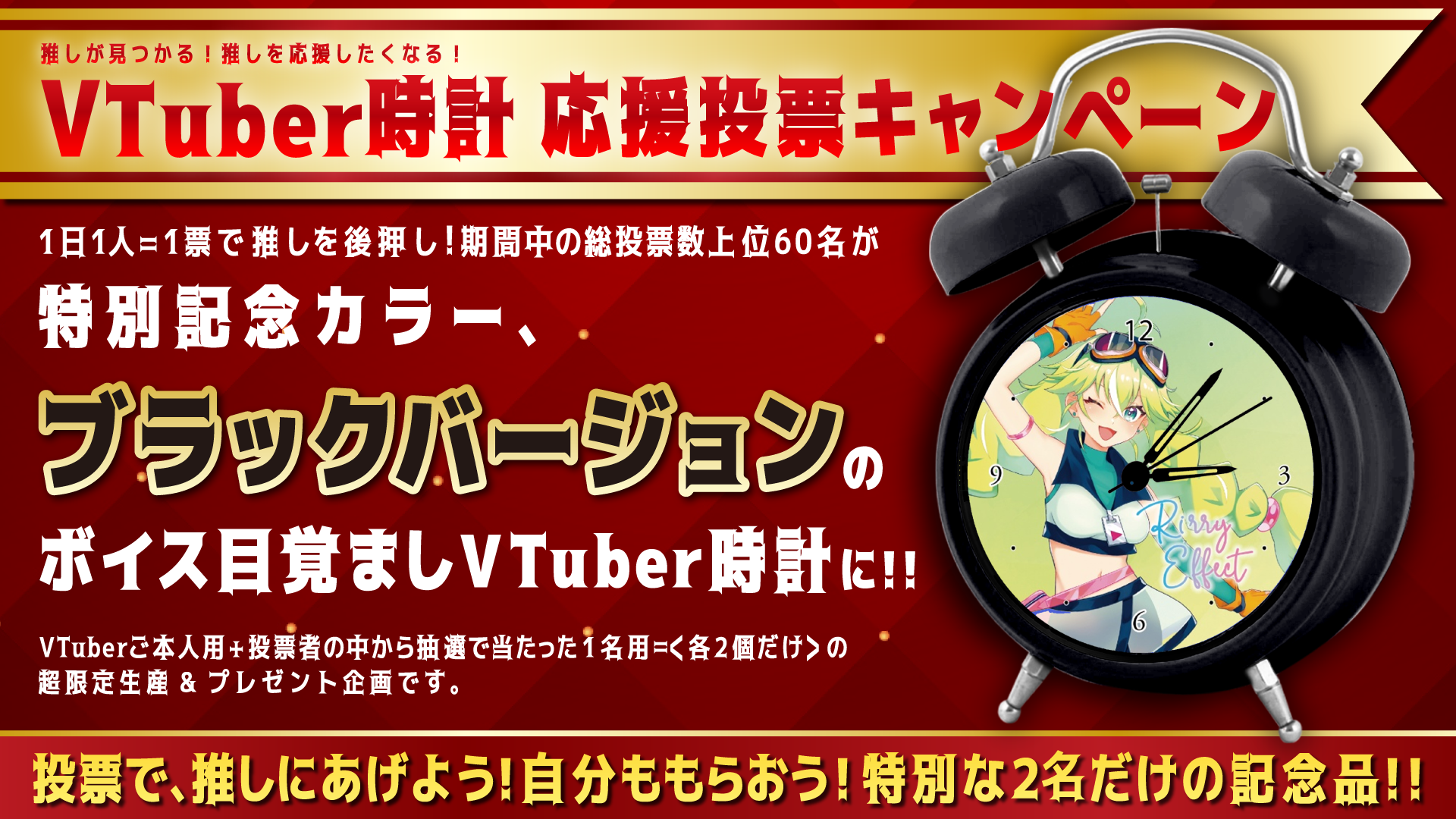 期間中に投票数の多かった上位60名には、特別記念カラーの「ボイス目覚ましVTuber時計」をVTuberご本人用と、そのVTuberに投票していただいた方の中から抽選で1名の方への計2個のみを、限定生産しプレゼントいたします。