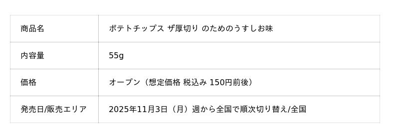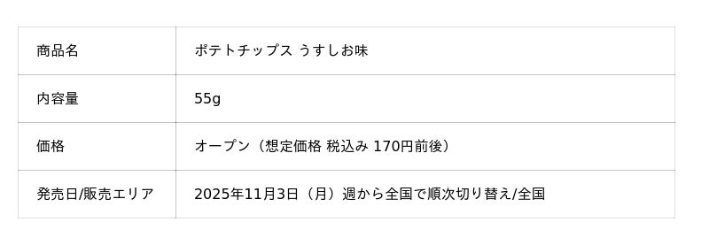 カルビー株式会社(本社:東京都千代田区、代表取締役社長兼CEO:江原 信)は、今年9月に発売50周年を迎えた「カルビーポテトチップス」ブランドの『ポテトチップス うすしお味』の中身とパッケージを3年ぶりにリニューアルし、2025年11月3日(月)週より全国で順次切り替えて発売します。あわせて同ブランドで展開している『ポテトチップス 超薄切り こだわりしお味』『ポテトチップス ザ厚切り のためのうすしお味』もリニューアルを行い、各商品の食感の違いを伝えてまいります。