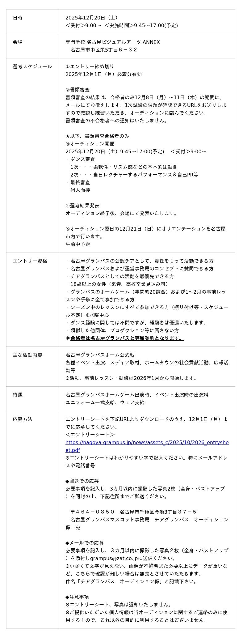2020年度発足した「チアグランパス」。このたび、公式戦やホームタウンの様々なイベントで活動する「チアグランパス」の2026年度新規メンバー(7期生)を募集いたします。これに伴い、チアグランパスの一員として活動していただけるメンバーを選考するオーディションを実施いたします。