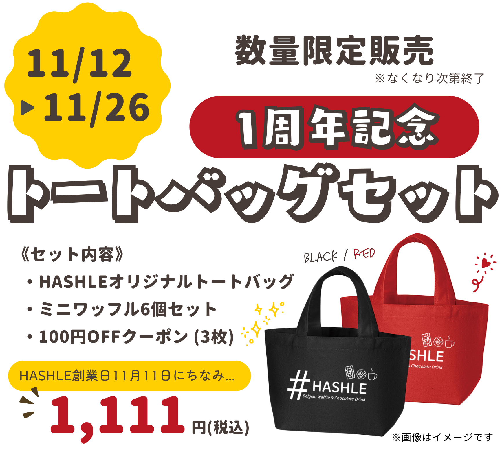 お客様への感謝を込めて、HASHLE創業日11月11日にちなみ1111円で販売する「トートバッグセット」<ミニワッフルとトートバッグ(ノベルティ)のセット>や復刻商品の販売、定番商品均一価格フェア、スタンプラリーなど様々な1周年企画を実施いたします。