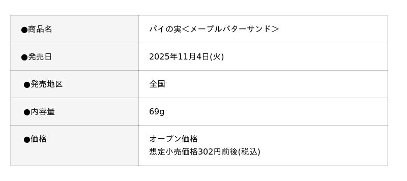 近年、「頑張る自分へのちょっとしたご褒美」=“プチ贅沢”ニーズが高まっています。特に秋冬は「メープル」や「バターサンド」が焼き菓子専門店・カフェで人気を集め、外食や飲料でも季節定番フレーバーとして注目されています。そこで「パイの実<メープルバターサンド>」は、ニュージーランド産発酵バター(*1)の香ばしいパイ生地と、カナダ産メープルシロップのパウダー(*2)を使用したチョコレートを組み合わせ、専門店のような味わいを一口に凝縮しました。さらに近年、音声コンテンツや没入型エンタメへの関心が高まる中、“食べながら体験する物語”という新しい提案を掛け合わせることで、単なるお菓子を超えた「食べるエンターテインメントお菓子」をお届けします。*1 発酵バター0.6%使用 発酵バター入りの原料を使用しています