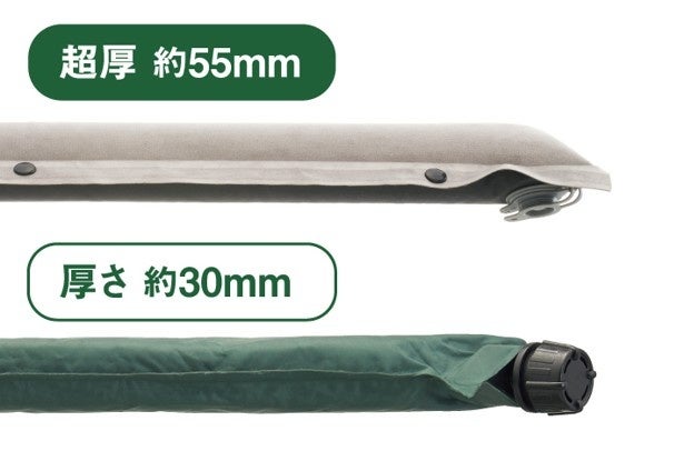 さらに、使い勝手の良さに加え、厚さ55mmの極厚マットでクッション性にすぐれ、地面の凹凸が感じにくく快適な寝心地です。さらに、マットの両サイドには連結可能なボタン付いており、シーンにあわせて拡張することができます。そのほか、空気を抜いて圧縮すればコンパクトになり、収納バッグ付きで持ち運びや保管にも便利です。キャンプなどのアウトドアシーンではもちろん、急な来客時や非常時など、さまざまなシーンで活躍します。