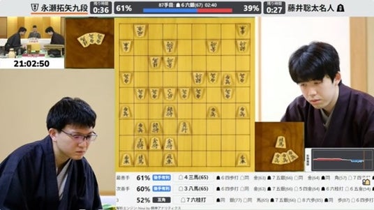 同時視聴者数が4万7千人を超えた第83期将棋名人戦七番勝負第5局(藤井聡太名人―永瀬拓矢九段戦)=2025年5月
