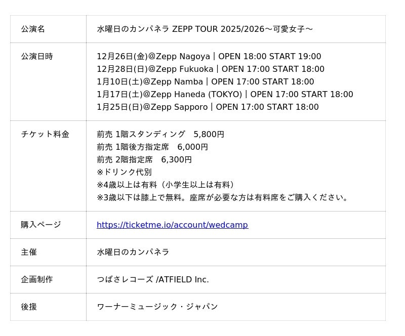 株式会社チケミー(本社:東京都港区、代表取締役:宮下大佑)が運営する電子チケットプラットフォーム「TicketMe(チケミー)」は、人気音楽ユニット・水曜日のカンパネラによる全国ツアー「ZEPP TOUR 2025/2026~可愛女子~」の一般先着チケット販売を開始いたしました。