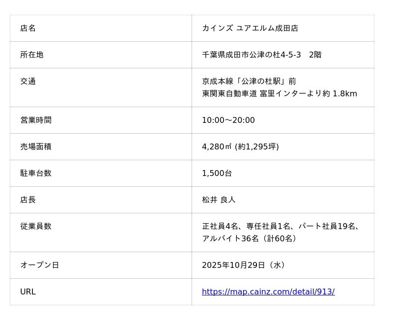 株式会社カインズ(本部:埼玉県本庄市、代表取締役社長 CEO:高家 正行)は、カインズ ユアエルム成田店が2025年10月29日(水)に、千葉県成田市にグランドオープンすることをお知らせします。