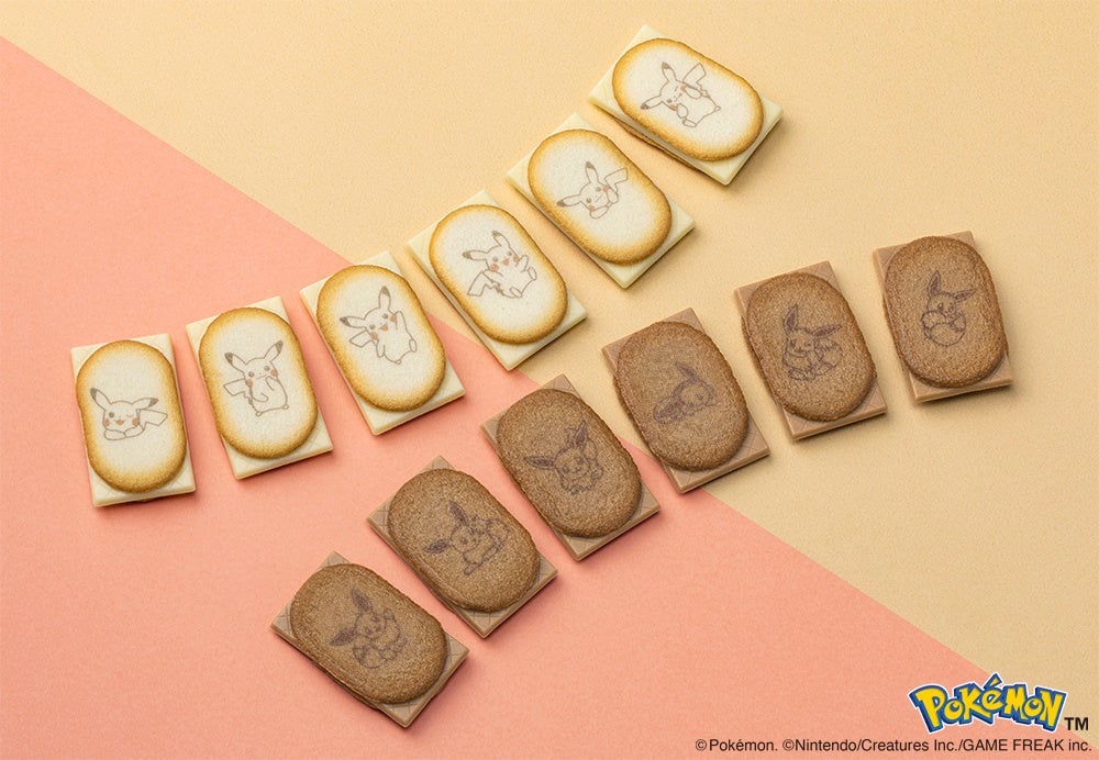 「はみ出しチョコのクッキーサンド」は、バナナヨーグルト味とキャラメルマキアート味の2つのおいしさをIN。バナナヨーグルトチョコレートをサンドしたクッキーにはピカチュウの絵柄を、キャラメルマキアートチョコレートをサンドしたクッキーにはイーブイの絵柄をそれぞれ描いています。シャリシャリッと軽やかに香ばしく焼きあげたラングドシャクッキーにショコラを思いっきりはみ出すことで、ショコラの存在感もサクサクのクッキーも一緒にお楽しみいただけます。