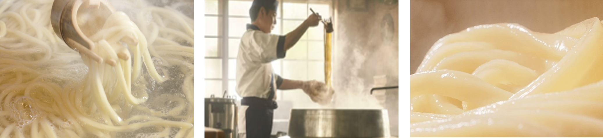 技と感性を磨いた「麺職人たち」が、100%国産の小麦粉を毎日打ち、その場で麺を切って、茹でて、つくりたてをお客さまに提供しているからこそ、独自のもちもちの食感とおいしさを守り続けることができているのです。