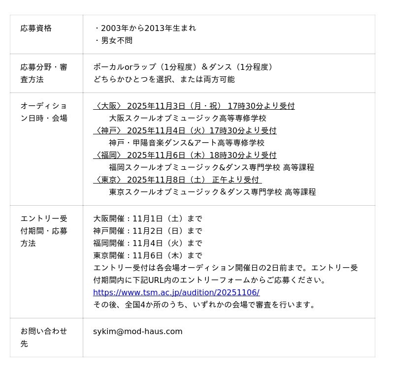 滋慶学園COMグループの総合専門学校「学校法人滋慶学園 東京スクールオブミュージック&ダンス専門学校(TSM)」と全国の姉妹校で、韓国の芸能事務所「MODHAUS」のオーディションを開催いたします。