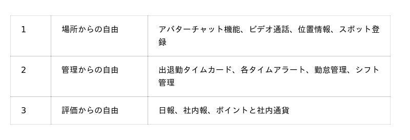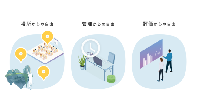 私たちは、現代社会が抱える3つの不自由(場所、管理、評価)を解消し、社員をストレスから解放することで、イノベーションを起こす企業が誕生する空間を実現していきたいと考えています。