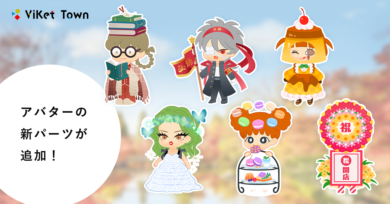 「ViKet Town(ビケットタウン)」では自分となって働くアバターが存在します。アバターには、頭、髪、目、口、服装、数種類の初期パーツから選択する事ができ、理想とする自分を生み出す事が可能です。 アバターを通してのコミュニケーションは、年齢、国籍、性別、見た目、生まれ持ったルーツによる様々な偏見をなくし、 純粋な気持ちで仲間とのプロジェクトの成功を目指す事ができます。 自分に自信がない人でも、働く新たな自分を生み出すことで、コミュニケーション能力の向上も期待でき、異空間で働くアバターは、様々なアイテムを身に着け、仲間とのコミュニケーションのきっかけともなります。秋冬シーズンに合わせた新パーツが追加!さらに、DRESSY CAFE大阪オープンを記念して、「PLACOLE&DRESSYオリジナルドレス」や「お花のティースタンド」衣装など、今月だけのスぺシャルパーツも多数登場!