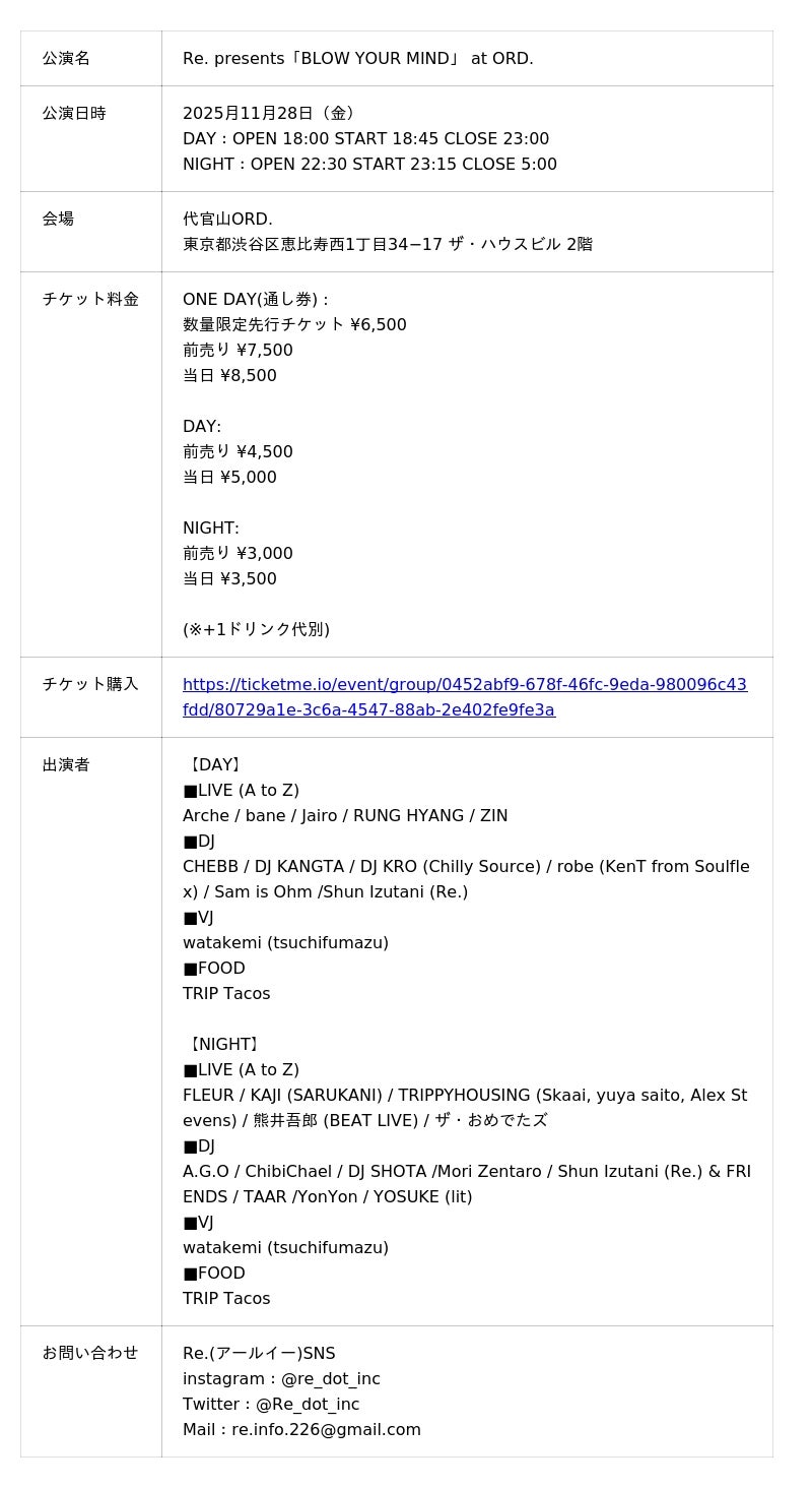 株式会社チケミー(本社:東京都港区、代表取締役:宮下大佑)が運営する電子チケットプラットフォーム「TicketMe(チケミー)」は、代官山ORD.で開催される音楽イベント「BLOW YOUR MIND」についてチケットを販売中です。