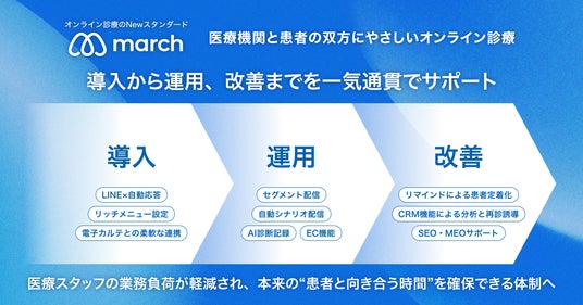 「march」は、医療機関と患者の双方にやさしいオンライン診療の実現を目指し、導入から運用、改善までを一気通貫でサポートします。