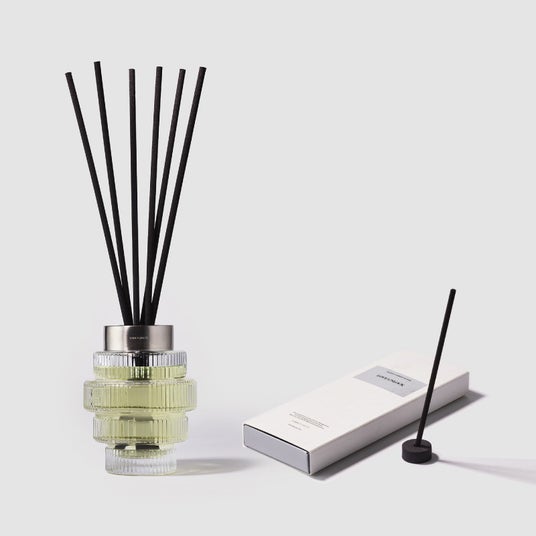 ディフューザーでありながら、香水のようにトップ・ミドル・ラストと、時間とともに香りが美しく移ろう。差し込む光や照明に呼応して、液体がゆらめき、色影の繊細な変化が、空間にやさしい奥行きを添える。ふとした瞬間に訪れる香りと光のゆらぎが、暮らしも心も、そっと整ってゆく。