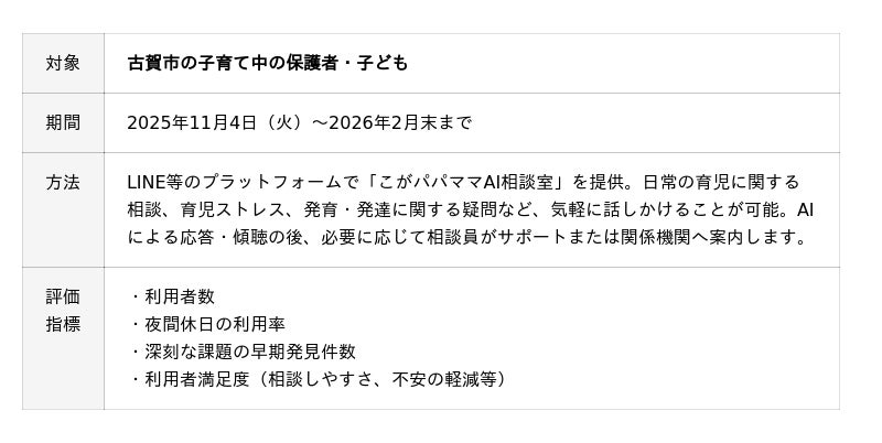 今回の「こが パパママ子どもAI相談室」は、その一環としてデジタル技術を活用し、保護者と子ども双方が安心して声を届けられる新しい仕組みを提供する先駆的な試みとなります。