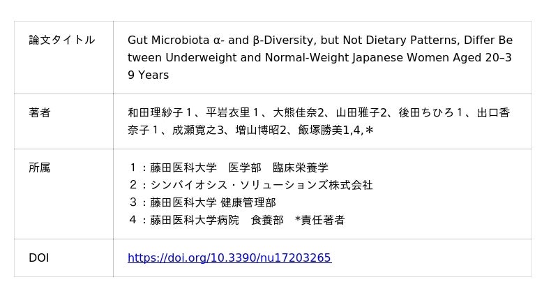 藤田医科大学(愛知県豊明市)医学部臨床栄養学 飯塚勝美教授とシンバイオシス・ソリューションズ株式会社(本社:東京都千代田区)は、共同研究により、20−39歳女性(計80名)を低体重群、正常体重群に分けて、食事の多様性とともに、腸内細菌の多様性を比較しました。食事調査に関して、摂取エネルギーや栄養素、食事の多様性は、低体重群と正常体重群で有意差が見られませんでした。一方で、低体重群は腸内細菌叢の多様性が低く、正常体重群に比べ、炎症に関係するとされる菌が多いことがわかリました。腸内細菌叢をターゲットとした食事療法により腸内環境が変化し、低体重が改善する可能性があります。