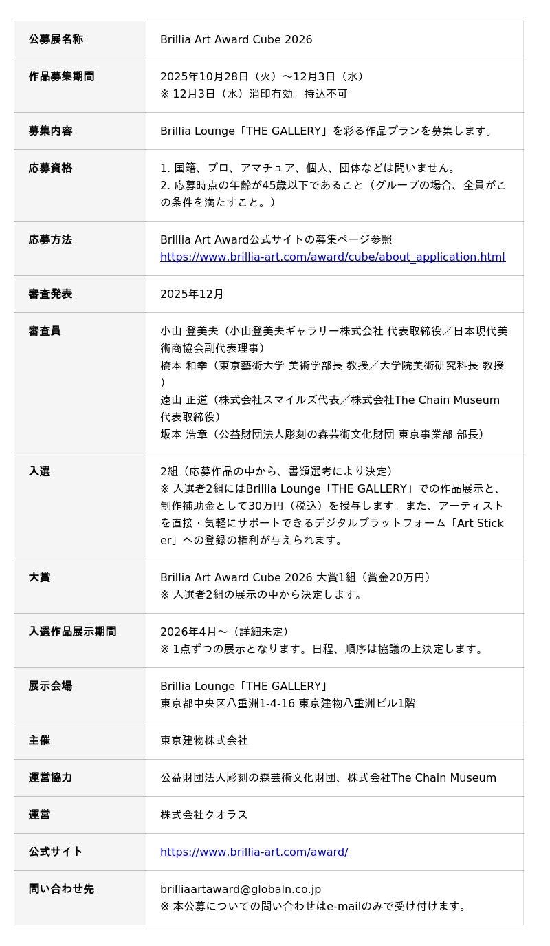 東京建物株式会社は、東京建物のマンションブランド「Brillia」におけるアートの取り組みの一環として、公募展「Brillia Art Award Cube 2026」(以下「本公募展」)を開催します。2025年10月28日(火)より作品募集を行い、入選した作品は東京建物八重洲ビル1階Brillia Lounge内の展示スペース「THE GALLERY」に展示されます。