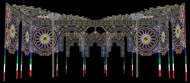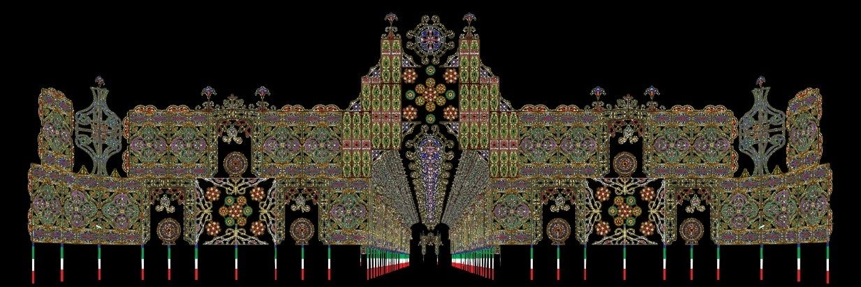 芝生広場に全長約50m最高部の高さ22mの光の壁掛け作品「スパッリエーラ」を設置します。また、南側園地では高さ約9m、幅約14mの「スパッリエーラ」2体を設置するとともに、地元著名食品関連企業等による「食の逸品」の提供と音楽ステージなどの協賛事業(KOBEディライト・ファウンテン)を実施します。