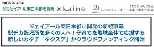 株式会社ジェイアール東日本都市開発(本社:東京都渋谷区、代表取締役社長:根本 英紀、以下ジェイアール東日本都市開発)が株式会社Mine.(本社:神奈川県横浜市、代表取締役:上村あかね、以下Mine.)と共創する子育て支援・一時預かりサービスの【TAKUJI STATION タクステ】が、社会貢献活動への寄付型プロジェクトなどを多く扱うREADYFOR(https://readyfor.jp/)にてクラウドファンディングを開始いたしました。