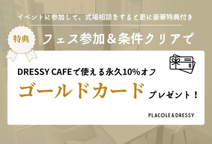 ウェディング初体験フェスにご参加いただき、条件クリアをされた新郎新婦にDRESSYCAFE名古屋・鎌倉・大阪で使用できる永久10%オフ「ゴールドカード」をプレゼント!結婚式準備、その後の結婚生活でもカフェでのひとときをよりお得に楽しめます。このゴールドカードは永続的にご利用いただけるため、特別な日の記念だけでなく、日常のひと息つく時間にも活用できます。(大阪店は11/1オープンとなります。)