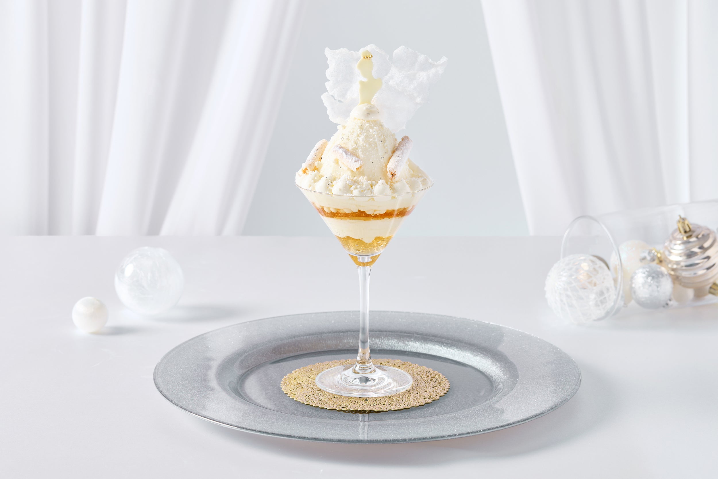 花嫁の純白のドレスをイメージして仕立てた、ローブ ド マリエシリーズのクリスマス限定パフェ。雪のように白く繊細なクリームを重ね、クリスマスシーズンにふさわしい華やかさと気品を表現しました。中にはマスカルポーネクリームや1688グラン・ブランのジュレ、グリオットチェリーを忍ばせ、ひと口ごとに変化する味わいをお楽しみいただけます。一年に一度だけ出会える、特別な“ホワイトクリスマス”の花嫁パフェです。