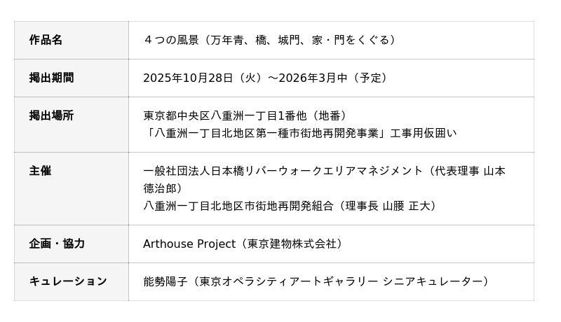 また、本展示では東京建物が本年発足した「Arthouse Project」※3が企画・協力として参画しています。アートとまちづくりのコラボレーションや若手アーティストの支援を通じて、地域文化を未来へ承継するとともに、大規模工事期間中におけるにぎわいを創出することで、魅力ある八重洲・日本橋エリアのまちづくりをより一層推進してまいります。