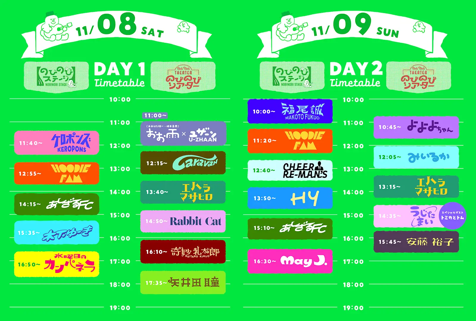 アーティストやお笑いタレントによる、多彩なライブが開催される「のびのびステージ」「のびのびシアター」タイムテーブル