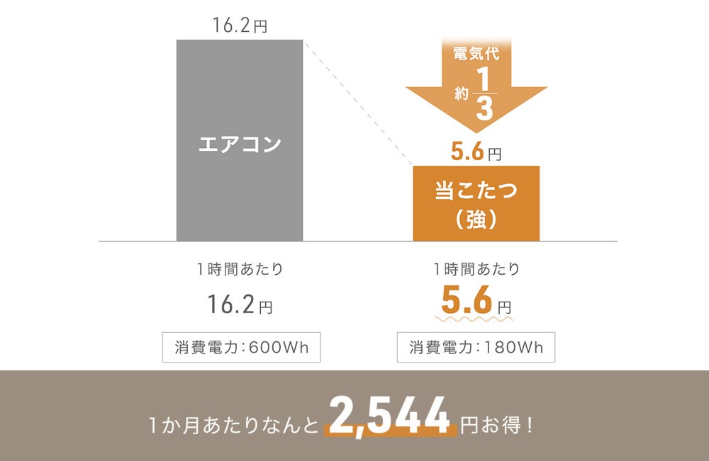 ※1時間あたりの消費電力は5時間運転した時の平均値、1か月あたりの電気料金は1日8時間で30日使用した場合の目安です。電力料金目安単価1kWhあたり27円で計算しています。