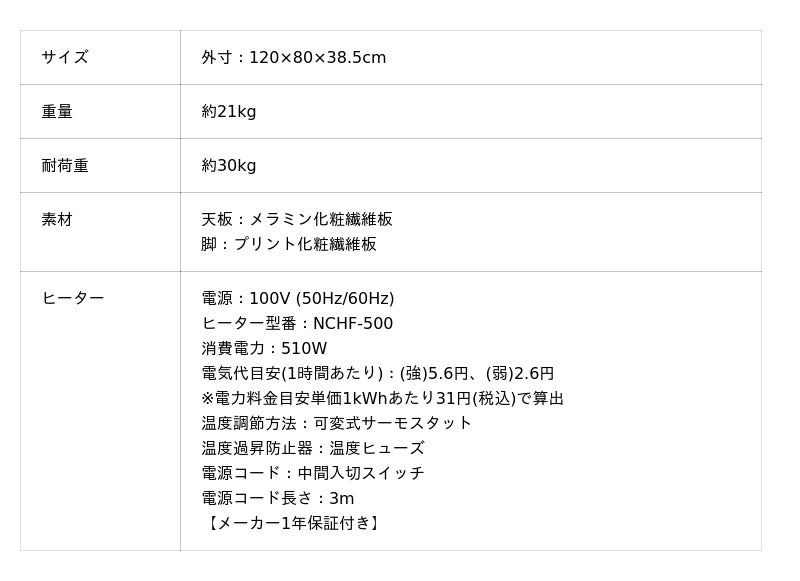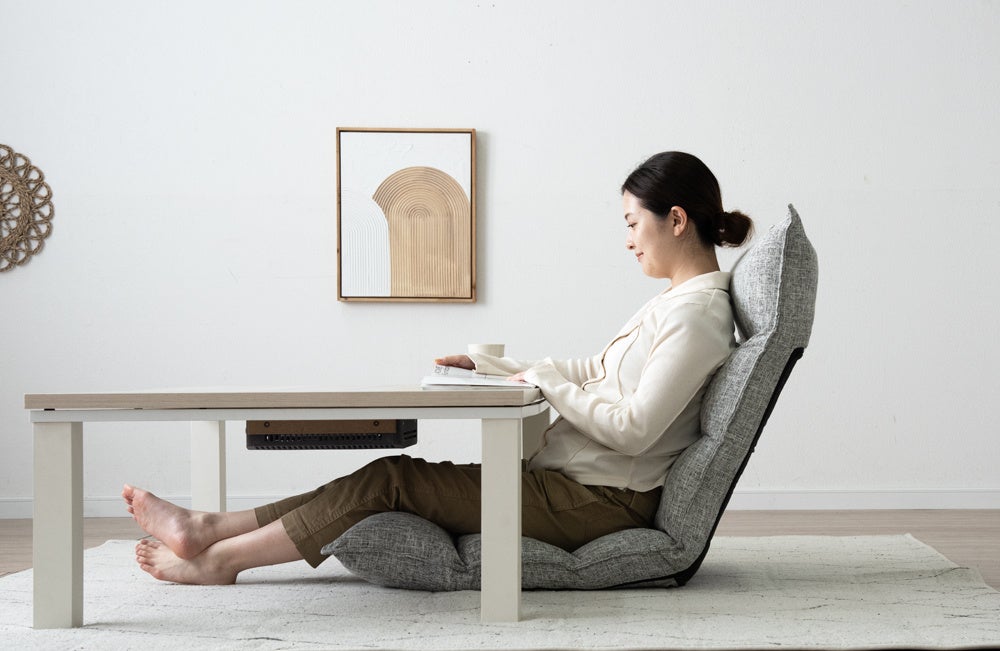 本製品の天板サイズは120×80cmで食事やPCなどの操作、家族や友人との団らんなどさまざまなシーンで活躍します。床からの高さは38.5cmでソファ前にも置きやすく、座椅子との相性も抜群です。こたつ布団をかけても圧迫感がなく、空間にバランスよく収まる設計になっています。