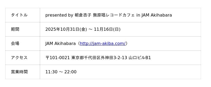 2025年10月31日(金) から11月16日(日)までの期間、メイド喫茶「JAM Akihabara」とのコラボカフェ『presented by 朝倉杏子 無原唱レコードカフェ in JAM Akihabara』を開催します。本コラボカフェでは、各アーティストをイメージしたコラボメニューの提供や描き下ろしSDイラストの展示、限定グッズの販売を行います。