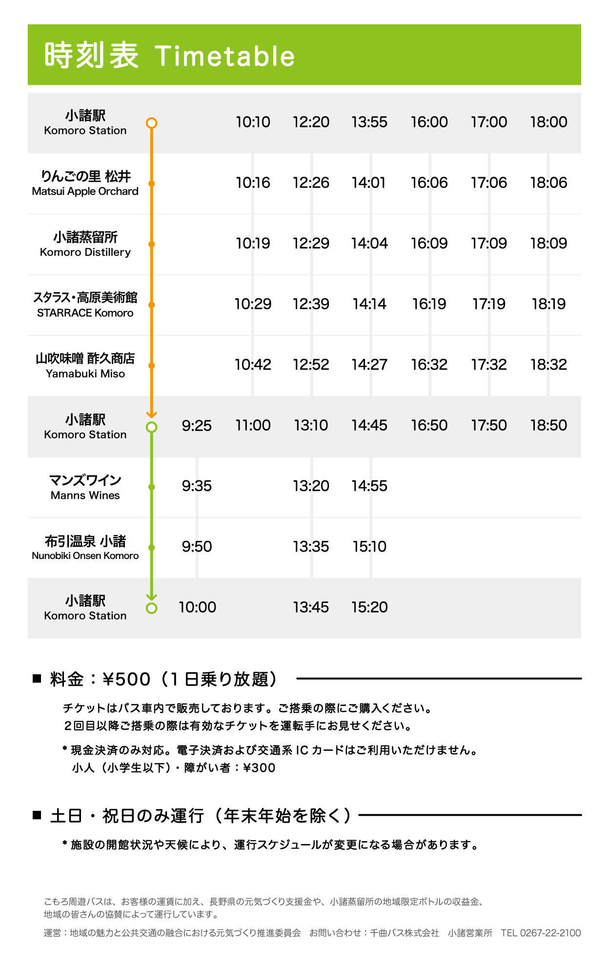 ※ 11月1日より、土日祝日に小諸蒸留所にお越しのお客様は当周遊バスをご利用下さい。