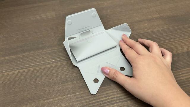 この「多機能カードケース&スタンド」にも、しっかりスタンド機能が搭載されています。安定性が高く、動画視聴やビデオ通話時にも便利です。