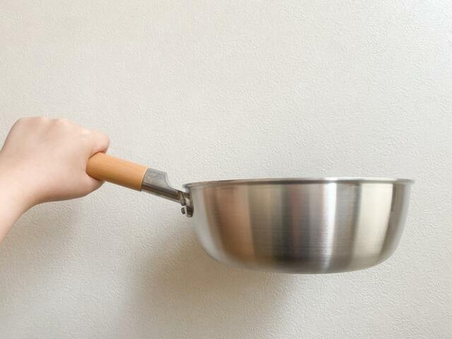 深さがあるため一般的なフライパンより大きいですが、重さは約650g。片手でも無理なく持てました。