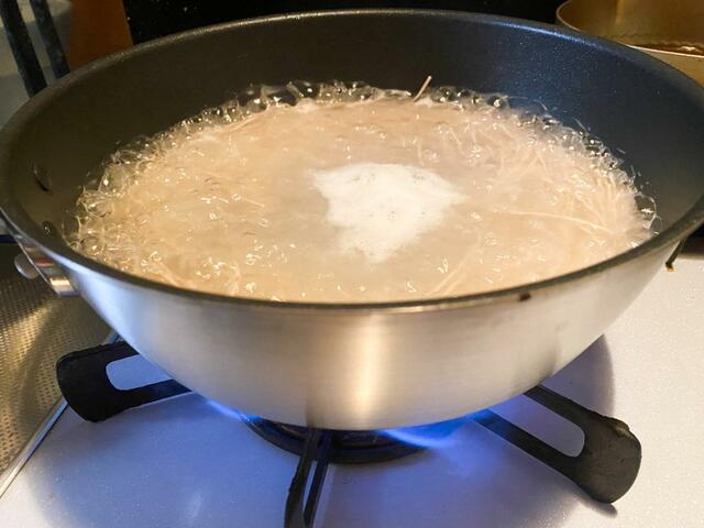 深型フライパンの特徴を活かし、そばを煮てみました。