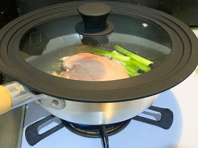 深型フライパンに鶏肉と長ネギ、水と調味料を入れて蒸し鶏をつくりました。