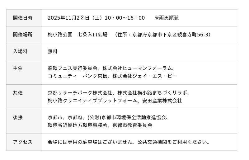 株式会社ニッセン(本社:京都市南区、代表取締役社長:羽渕 淳)は、梅小路公園(住所:京都府京都市下京区観喜寺町56-3) で11月22日(土)に開催されるリユースイベント『循環フェス』に出店します。
