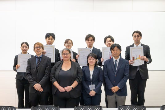 学内予選を通過した6名(後列)と、審査員3名、麻生外語観光&ブライダル専門学校 石井校長代行(前列)