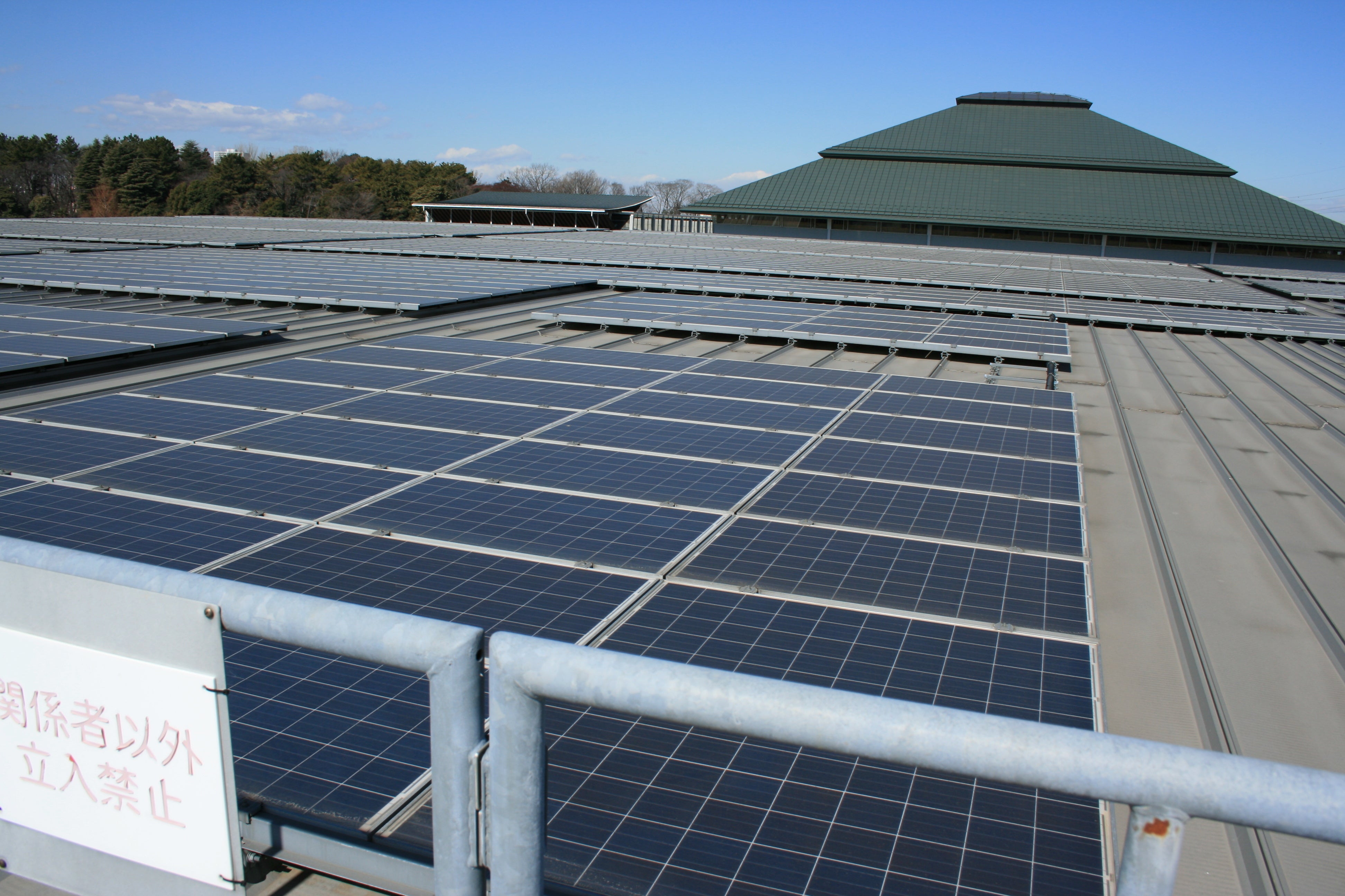 江田:エコアリーナは、パティネレジャーが運営する、冷却設備だけではなく建物、照明、空調も環境にやさしい製品や技術を用いて構成されたアイスリンクの総称です。ここ、埼玉アイスアリーナの例で言えば、製氷設備や場内の除湿に自然冷媒機器を採用し、屋根全体に1,680枚の太陽光パネルを敷き詰めて、電気を作りつつ外側から遮熱する作りになっています。