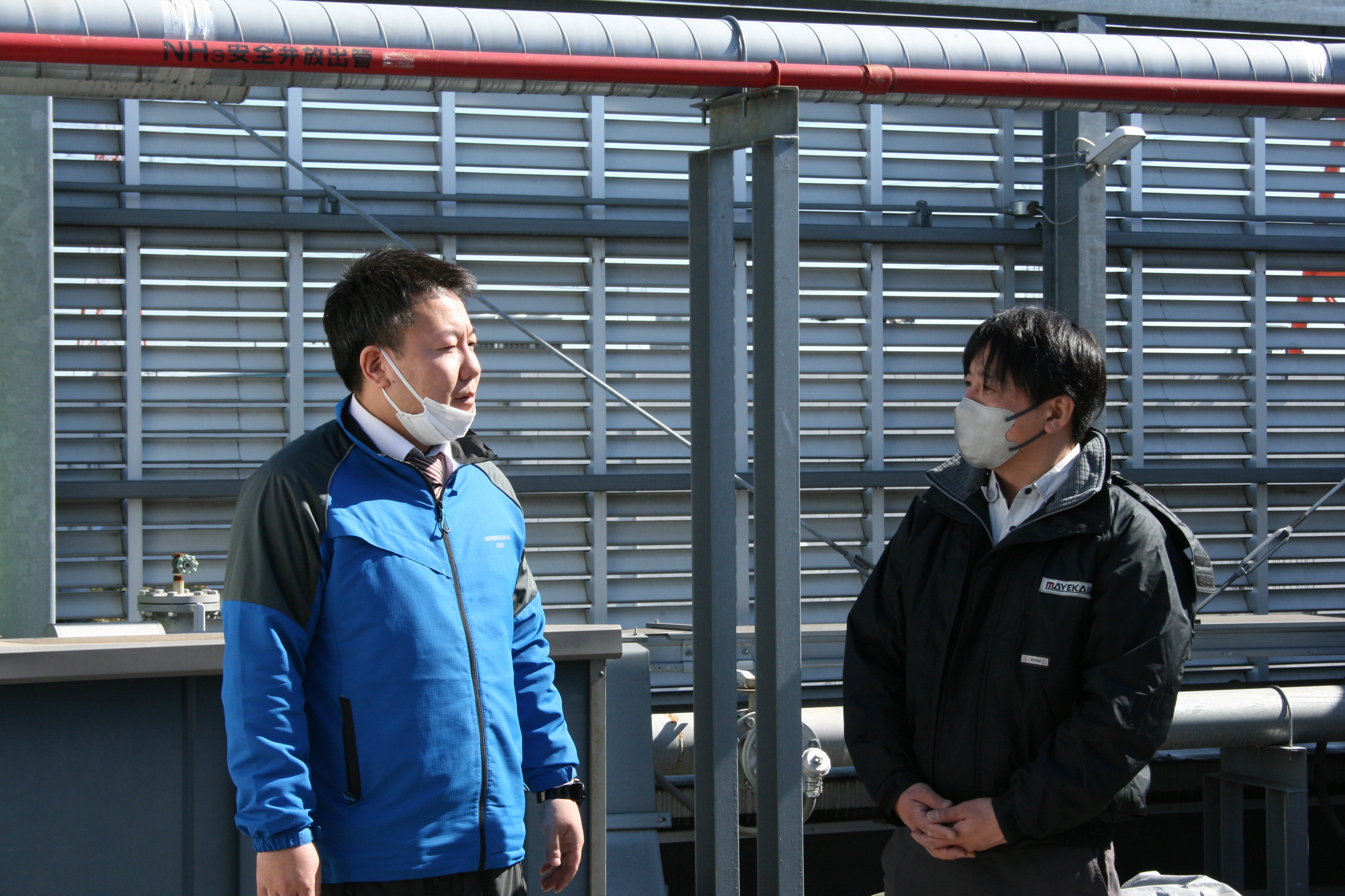 設備メンテナンスについてマエカワの担当者(右)と意見交換する江田支配人(左)