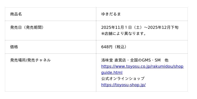 とよす株式会社(本社:大阪府池田市 社長:眞田 昌彦)は、とよす洛味堂『ゆきだるま』を、2025年11月1日(土)から期間限定で発売いたします。