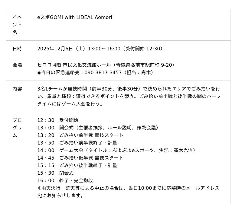 株式会社Life Reversal Gaming.(所在地:東京都文京区、代表取締役:高木 光治)は、青森県への地域貢献を目指し開催される「eスポGOMI with LIDEAL Aomori」の運営に、eスポGOMI開催委員会の一員として参画いたします。なお、本イベントは、青森県全域を本拠地とするサッカークラブ「LIDEAL Aomori」(代表理事:多々良 敦斗)が開催するものです。