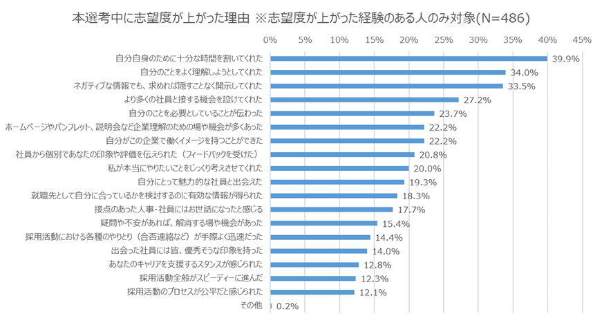 - 本選考中に志望度が上がった理由を確認したところ、「自分自身のために十分な時間を割いてくれた」「自分のことをよく理解しようとしてくれた」など、企業の学生への姿勢が影響していた。