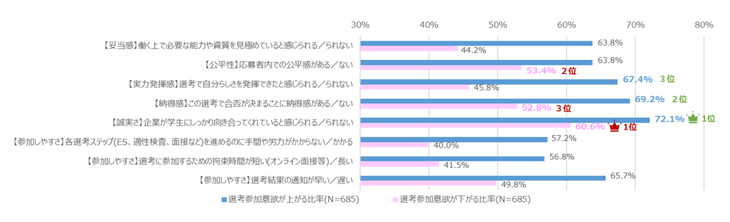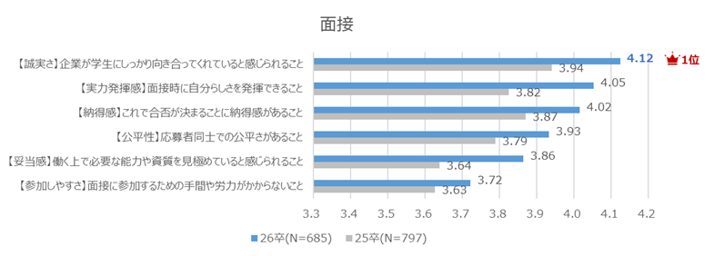 Topic1:「誠実さ」が2年連続で選考参加意欲への影響度1位。学生が最も評価する選考プロセスは個人面接