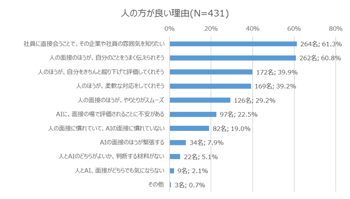 - 人に評価されたい学生(全体の63.0%)が上げる理由としては「社員に直接会うことで、その企業や社員の雰囲気を知りたい」「人の面接のほうが、自分のことをうまく伝えられそう」と回答する割合が高く、情報収集と見極め不安の両方の観点が重視されていることがわかった。