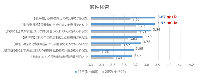 ⇒昨今はオンライン上で人が受検状況を監視する適性検査が登場し、多くの学生が経験している。監視による受検の公平性担保の意識の高まりを学生が肌で感じることで、公平性の重要性を強く意識する結果となった可能性がある。