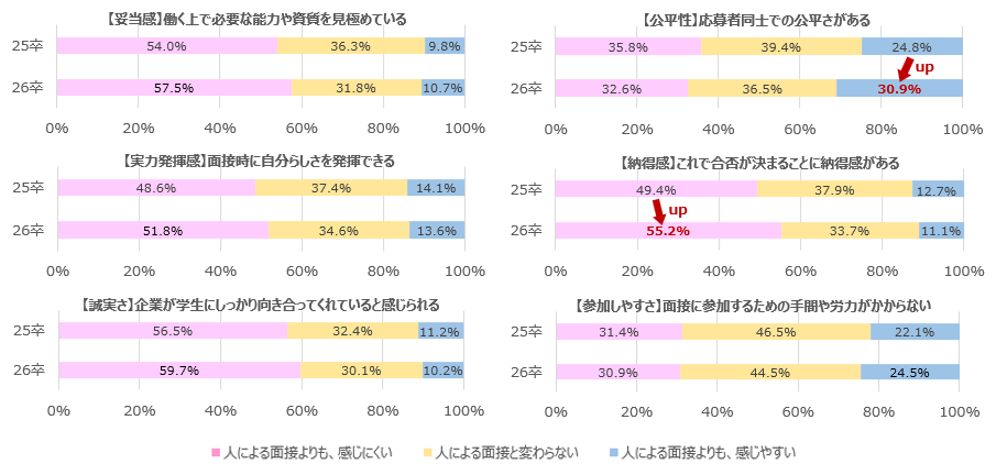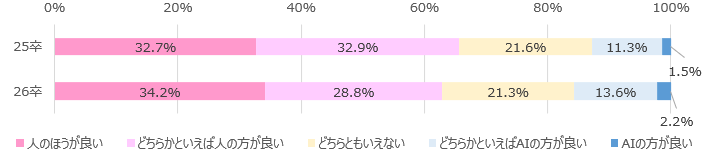 - 「納得感」については「人による面接よりも、感じにくい」と回答した割合が25卒よりも増加。一方、「公平性」については「人による面接よりも、感じやすい」と回答した割合が25卒よりも増加していた。