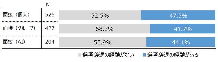 - 個人面接・グループ面接・AI面接で、選考辞退の経験があるか、またそのきっかけは何か確認したところ、各面接形態の経験者のうち41.7~47.5%に辞退経験があり、そのうち個人面接の辞退経験が一番多い結果となった。