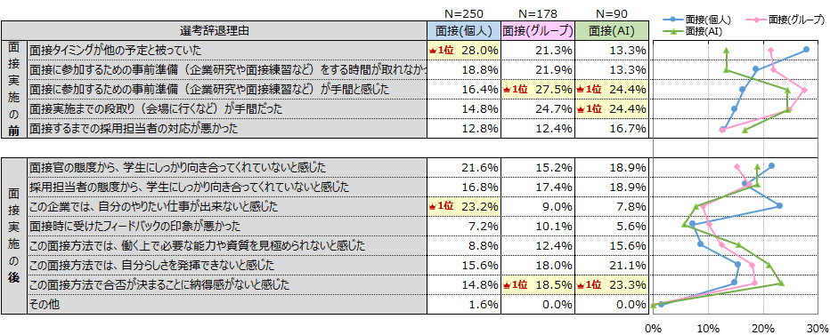 面接実施後の辞退理由1位は、個人面接では「やりたい仕事ができない」、グループ面接・AI面接では「面接方法への納得感のなさ」