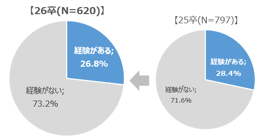 - 近年増加しているAI面接への学生からの評価結果を確認するためにAI面接経験有無を確認したところ、調査対象全体のうちAI面接経験者は26.8%と、25卒の28.4%から1.6ポイント減少した。