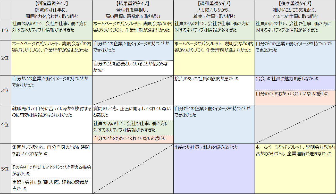 - 学生の性格タイプ別に志望度が下がった理由を確認したところ、タイプにより志望度低下の理由に違いが見られた。