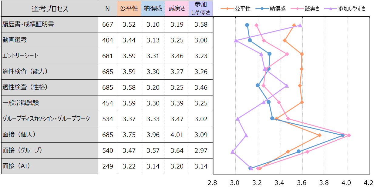 図表2:各選考プロセスへの候補者の評価(公平性・納得感・誠実さ・参加しやすさを抜粋)